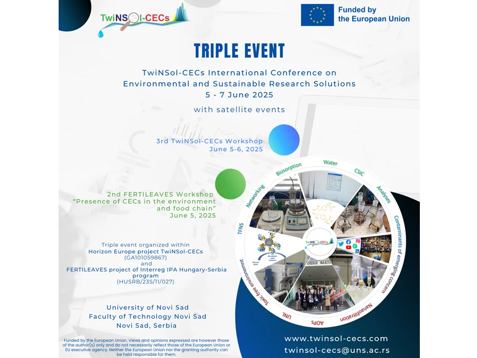 In order to achieve comprehensive, discernible results in the short- to medium-term resulting in long-term prevention and mitigation solutions for environmental and health concerns, it is necessary to fully mobilize available research, innovation and technological capacities across Europe, including those “excellence pockets” in lagging regions, as only harmonized research activities can bring solutions to systematic and ubiquitous problem of constant emission and accumulation of numerous contaminants of emerging concern (CECs) in the environment. As one of the leading academic players in Serbia, involved in preliminary monitoring studies of different trace contaminants in the environment and food, including analysis of some chemical classes belonging to CECs, Faculty of Technology Novi Sad (TFNS) at University of Novi Sad recognized an opportunity to reinforce own capacities in innovative CECs analysis and removal methodologies through twinning with the EU top-class leading institutions in domain of environmental and sustainability research under HORIZON EUROPE progamme of European Union. The TwiNSol-CECs will create the collaborative conditions required for TFNS to expand and implement its research in the field.